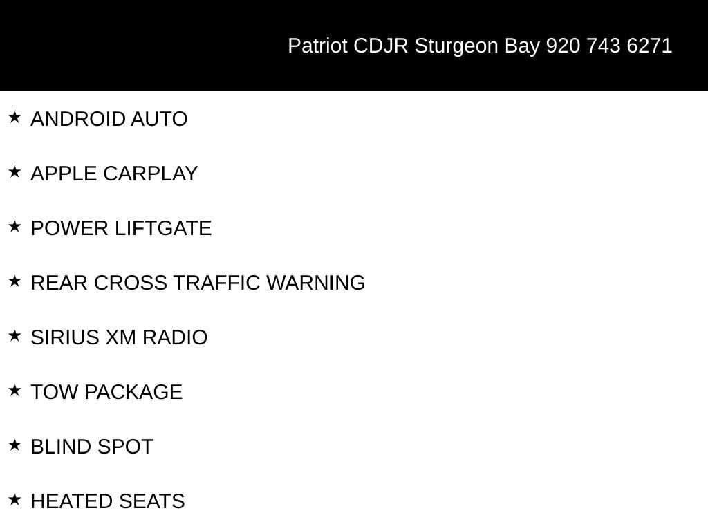 Must finance at standard rates to receive any/or all Patriot discounts, PRICE DOES NOT INCLUDE TAX, TITLE, LICENSE, SERVICE FEE OF $399, DEALER OPTIONS,OR PATRIOT PACKAGE OF $1995. (PAINT PROTECTION, FIRST 2 OIL CHANGES AND A TIRE ROTATION, ROAD HAZARD PROTECTION, WINDSHIELD PROTECTION. Price includes: $1500 - 2024 National Engine Bonus Cash. Exp. 04/30/2025 $3600 - 2024 National Power Dollars Retail Bonus Cash . Exp. 04/30/2025 $500 - 2024 DODGE National Performance Days Bonus Cash. Exp. 04/30/2025